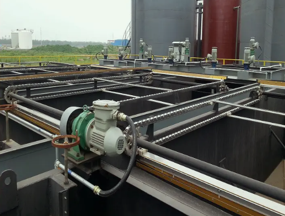 在分離區(qū)起端刮板放下,插入液面,向前進(jìn)行刮渣,將渣刮入排渣槽,到終端是刮板抬起,脫離液面,刮渣機(jī)返回,開(kāi)始下一個(gè)循環(huán)。